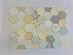 Fabrics cut and glued around the paper pieces. Just decide on the layout and start stitching. This curated selection is a one off pack. Truly unique !